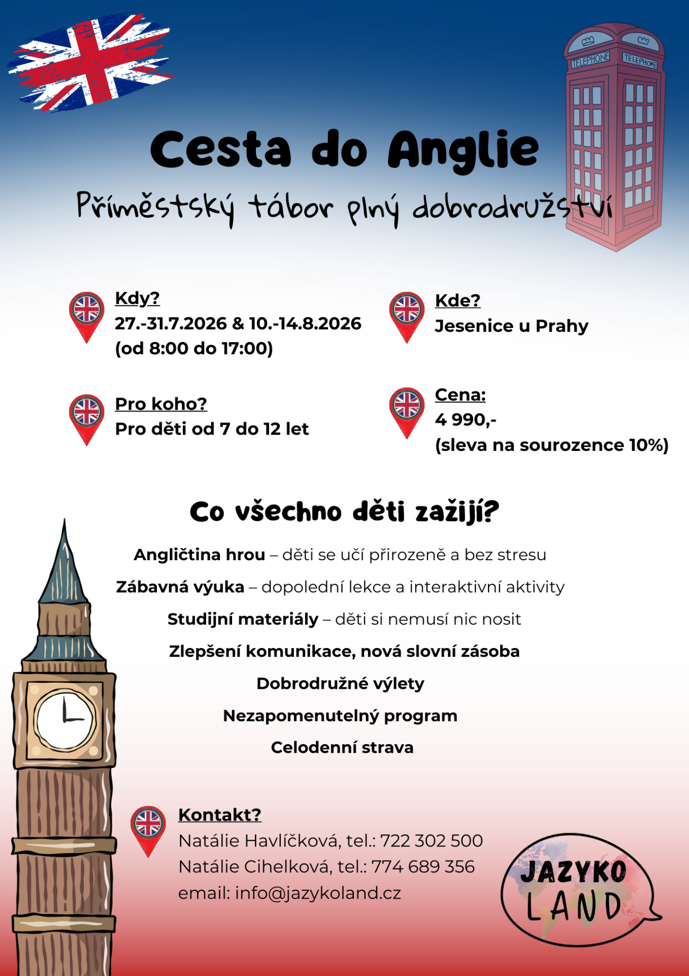 Rádi bychom vám dali vědět o našem letním příměstském táboře "Cesta do Anglie". Pro více informací nás neváhejte kontaktovat. Těšíme se na vás!:)